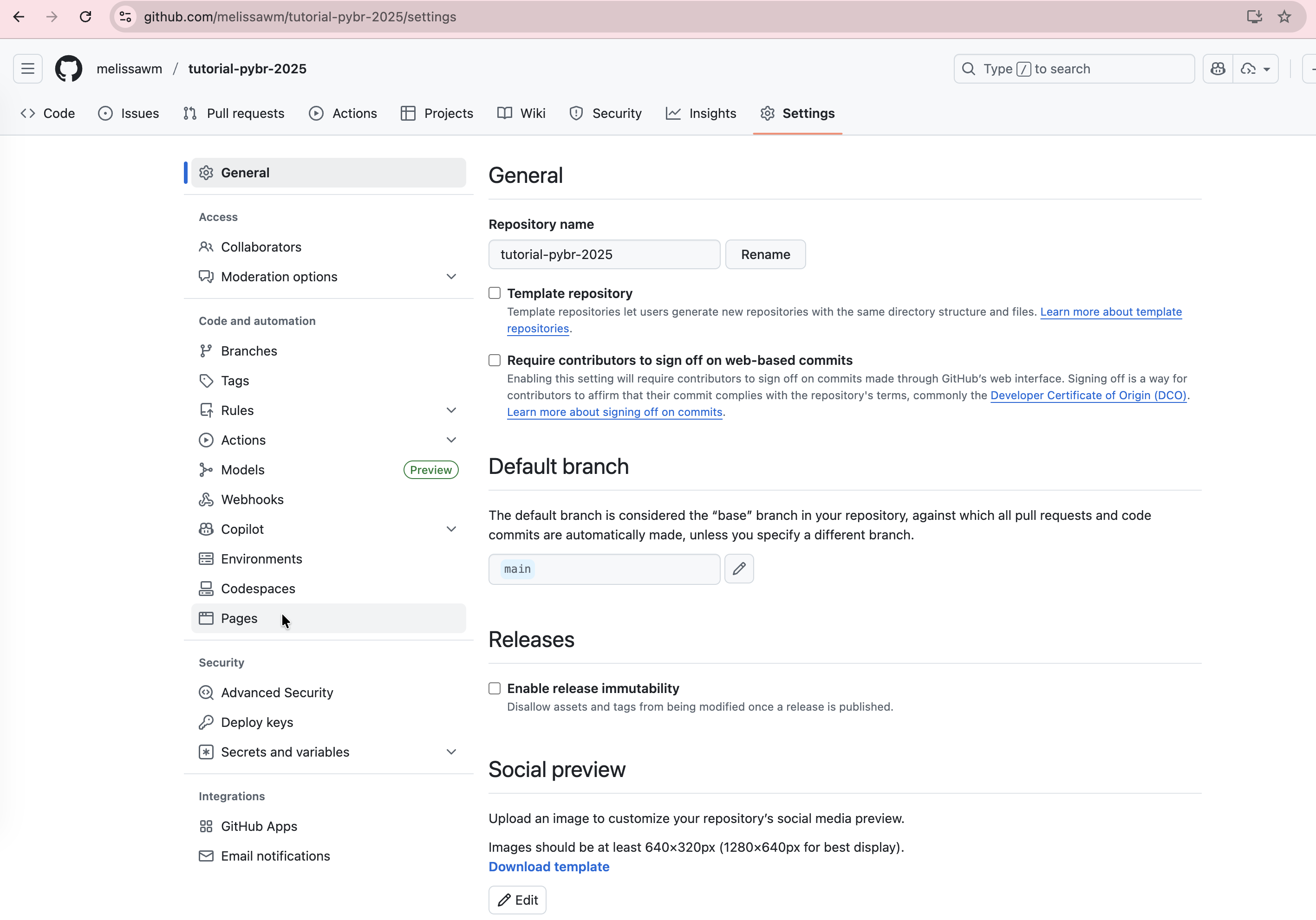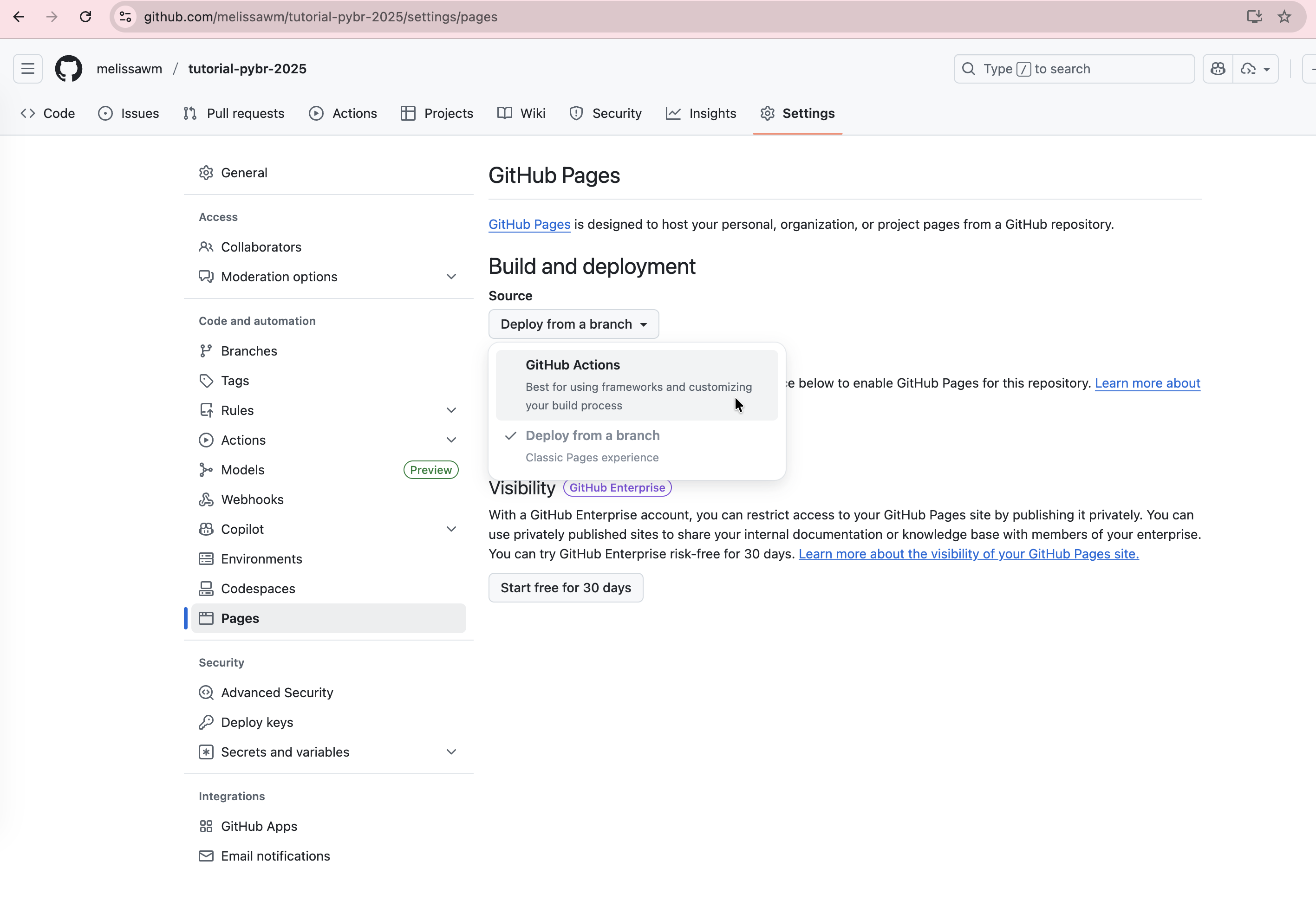- Role para baixo até a seção “GitHub Pages” e selecione a opção “GitHub Actions”.