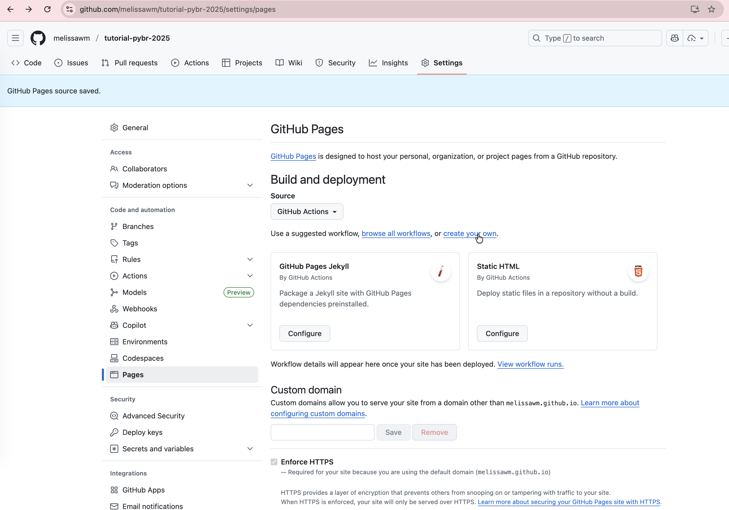 uses: actions/deploy-pages@v4- Salve e faça o commit do arquivo de workflow.